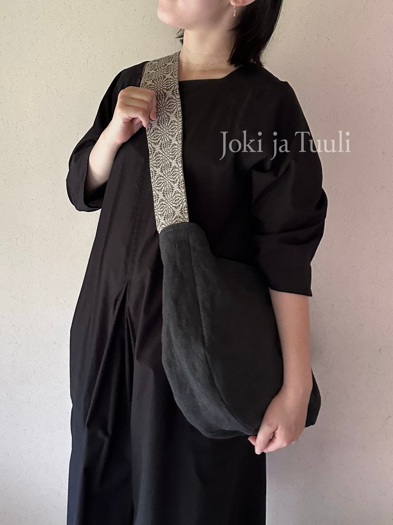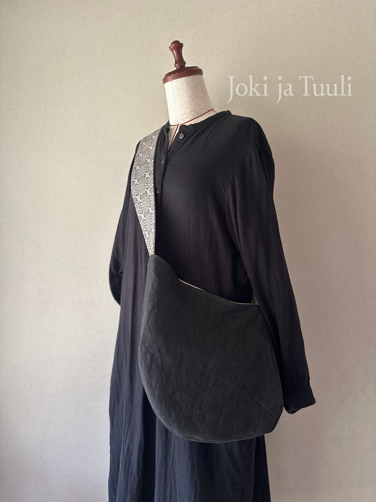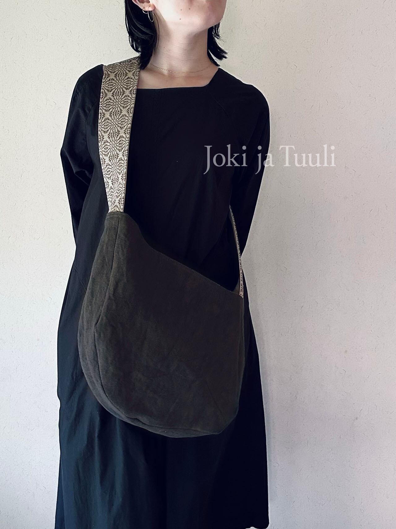 [手織りベルトリネンショルダーバッグ] ブラック