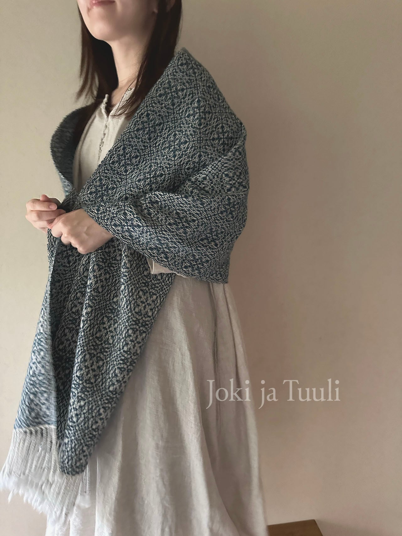柔らかなライトグレーの経糸にグリーンがかったブルーの緯糸で織りなす繊細な柄域です。