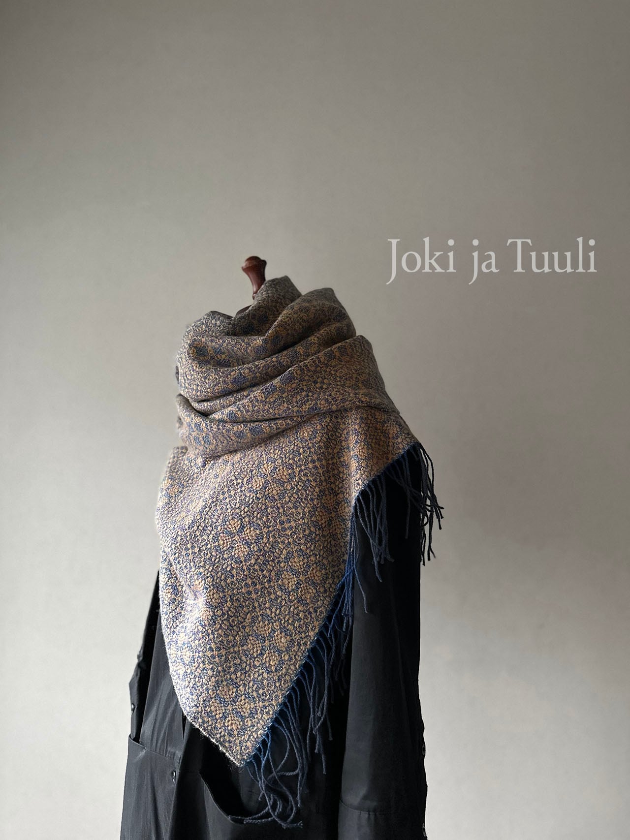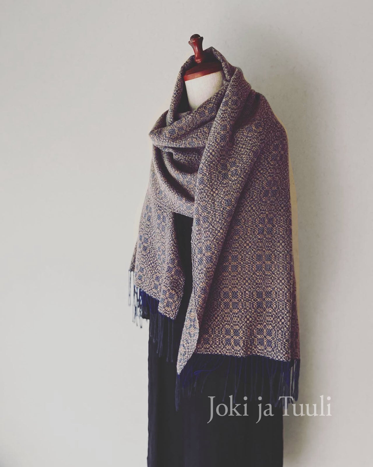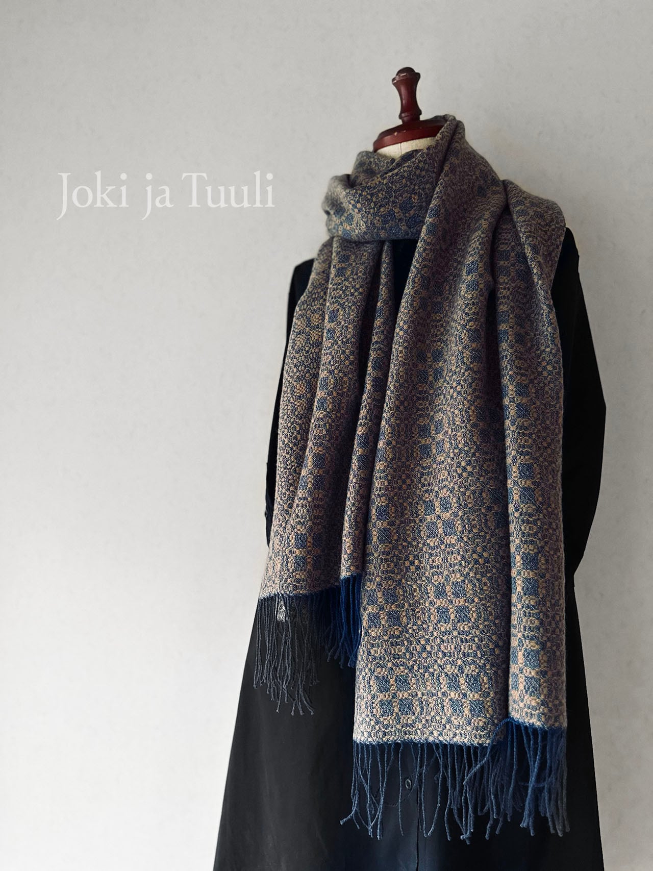 細番手の経糸を使っている分薄手ですが、十分な幅と長さがあり襟元に巻くとお写真の様にボリュームがあり、また羽織ればコートを一枚羽織ったかのように包み込みます。
