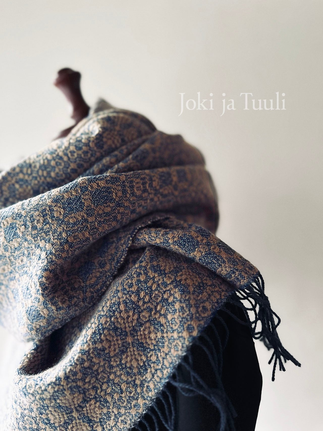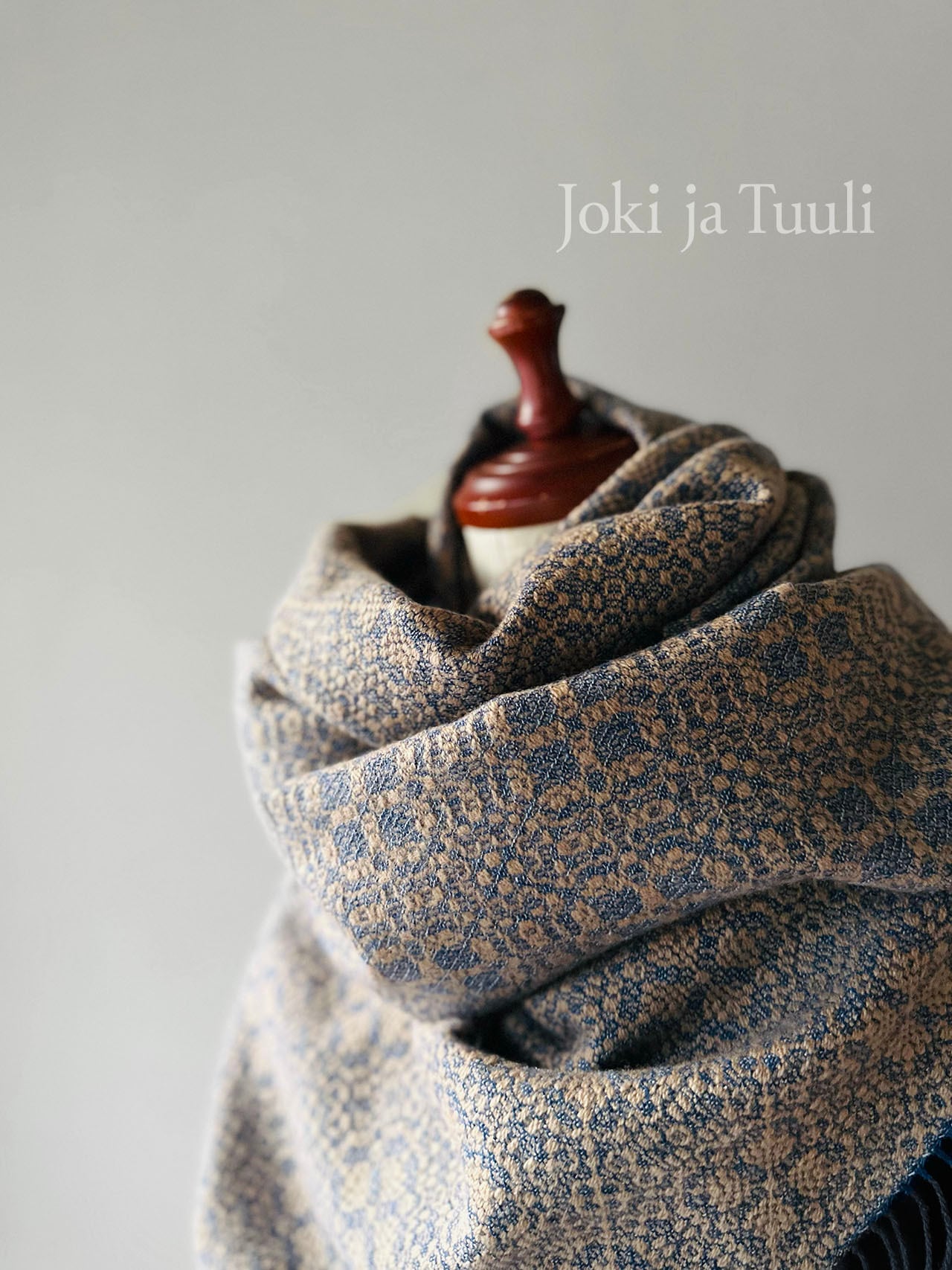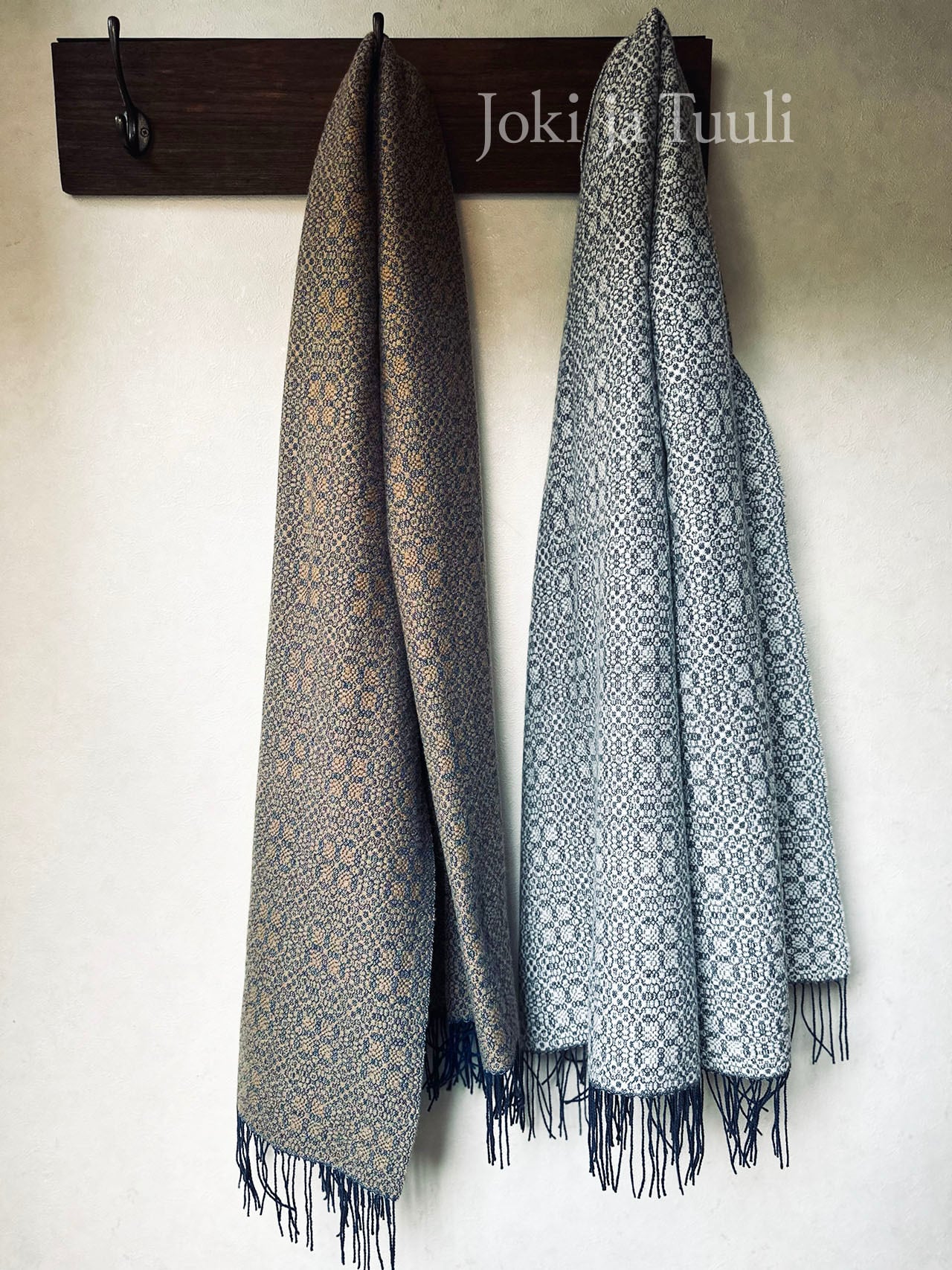 細番手の経糸を使っている分薄手ですが、十分な幅と長さがあり襟元に巻くとお写真の様にボリュームがあり、また羽織ればコートを一枚羽織ったかのように包み込みます。
