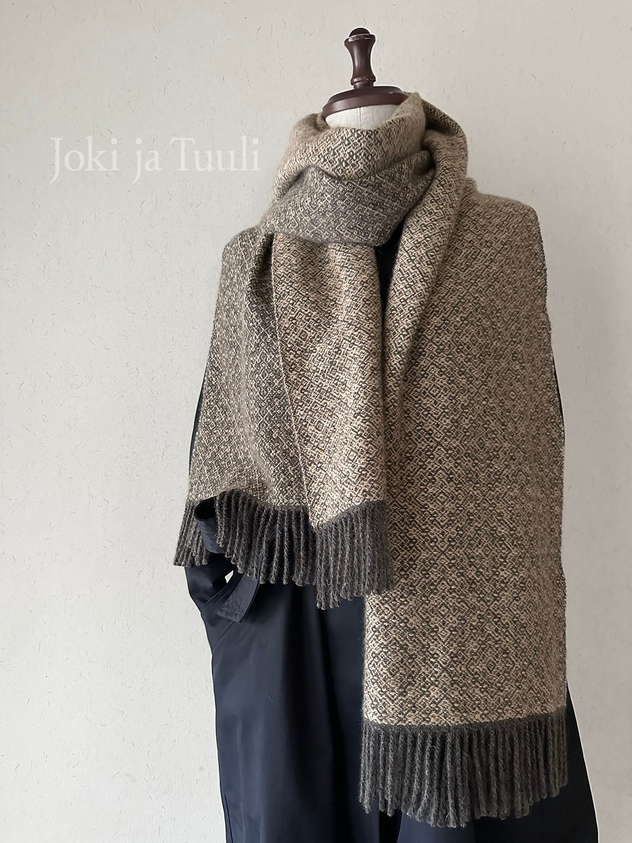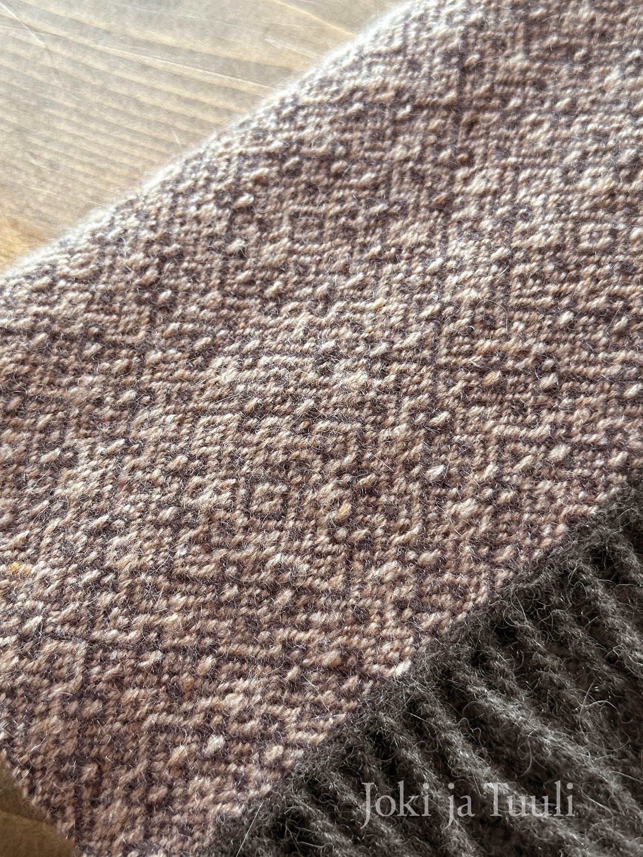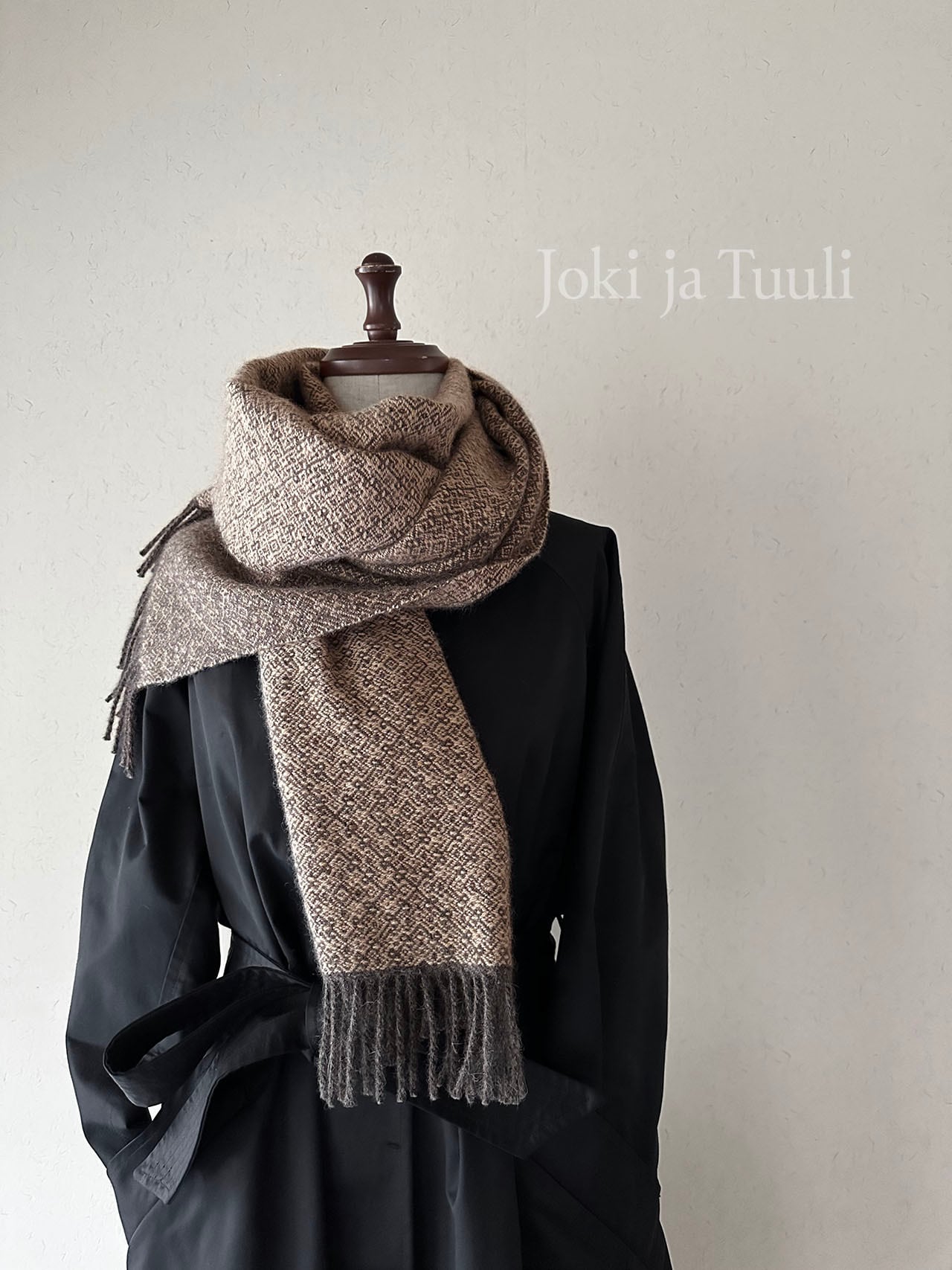 チャコールのような深いコーヒーの様な色合いの縦糸に、味わいのあるネップの入った甘いモカ色の緯糸で繊細な模様を織り上げました。