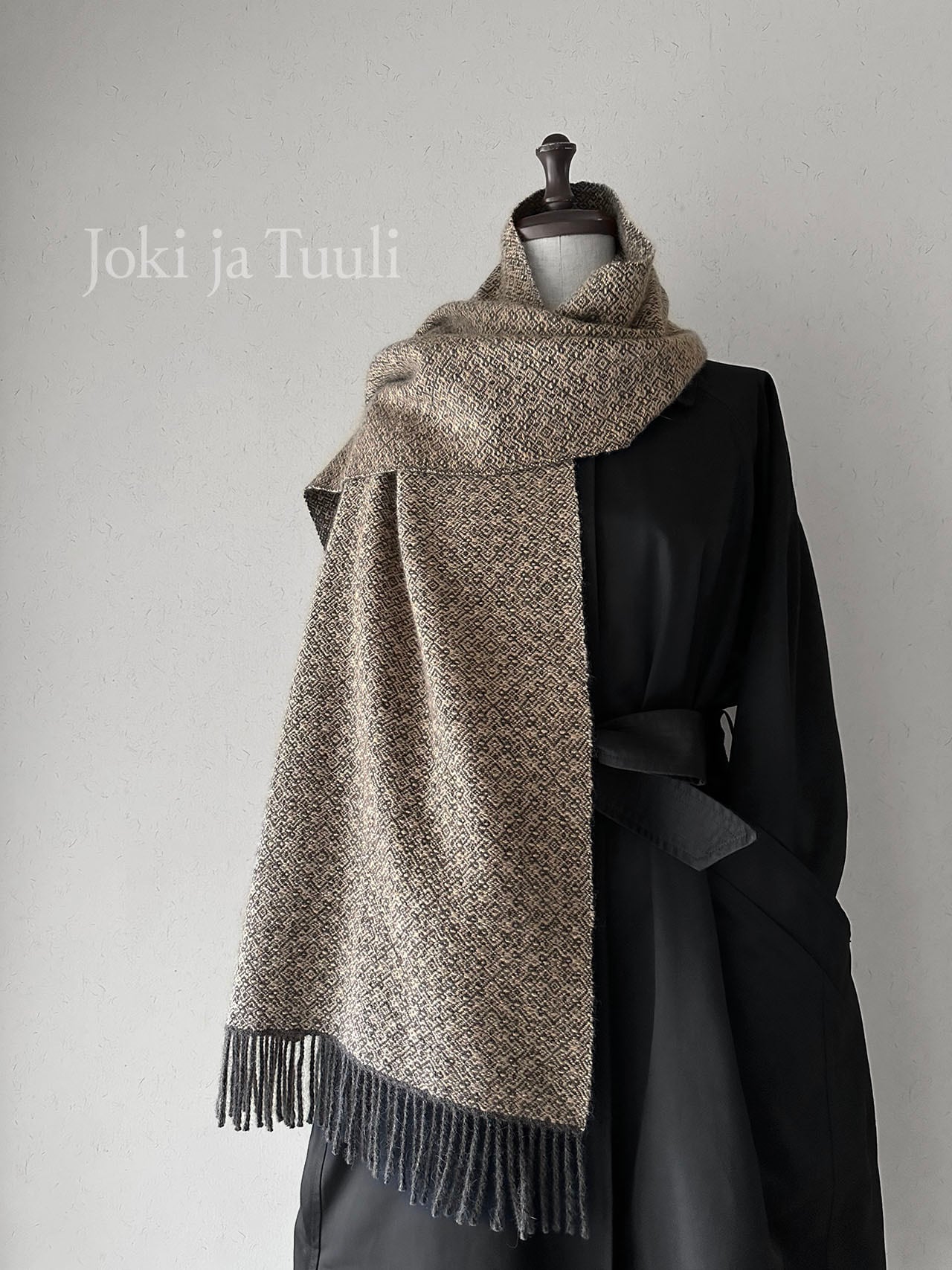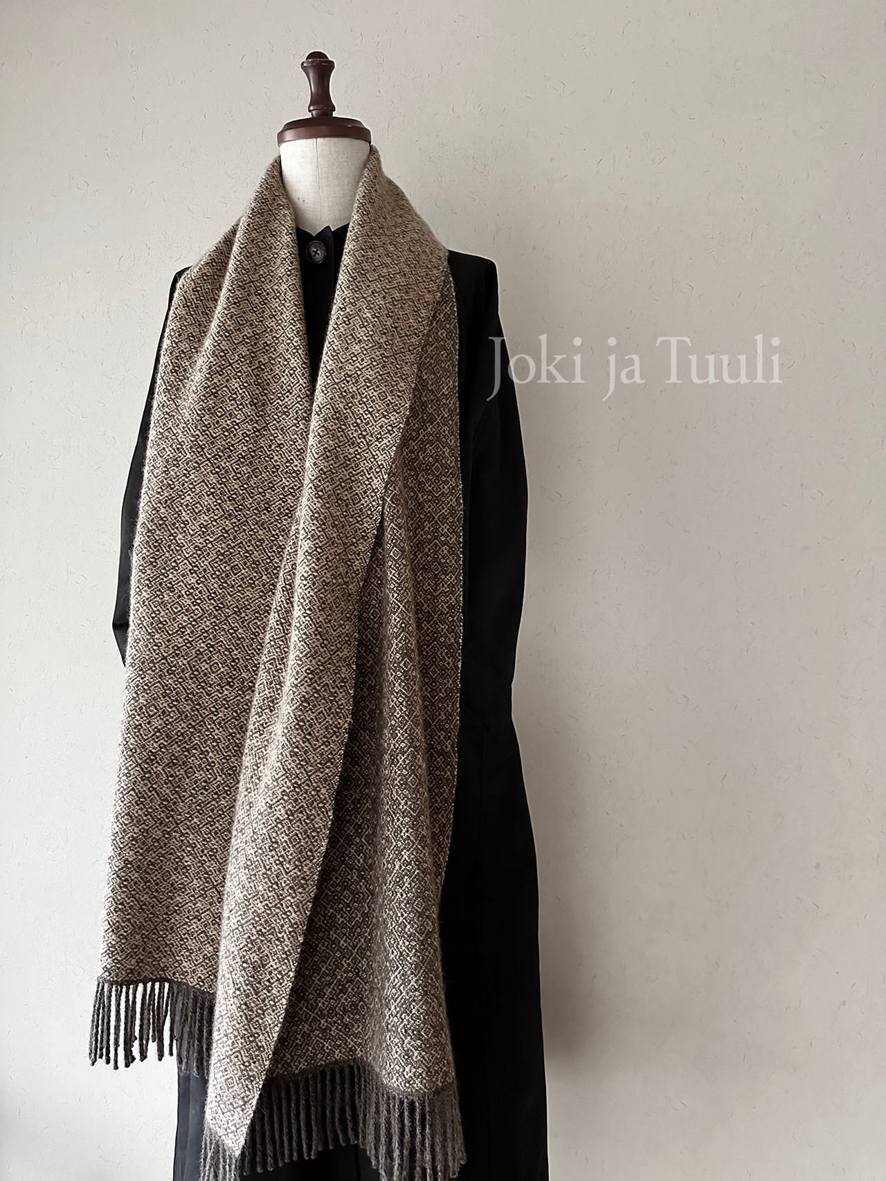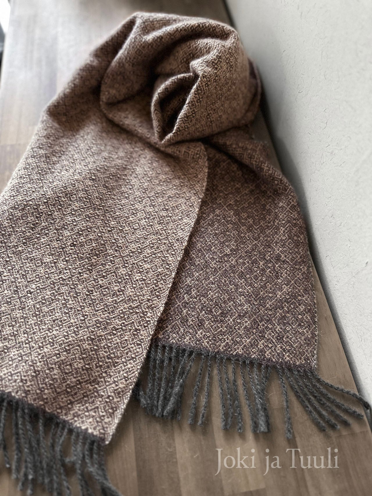 チャコールのような深いコーヒーの様な色合いの縦糸に、味わいのあるネップの入った甘いモカ色の緯糸で繊細な模様を織り上げました。