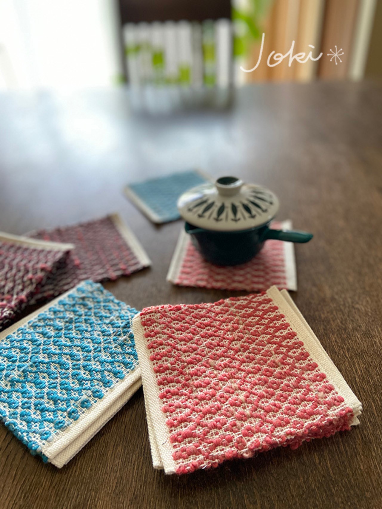 約12cm角と小さなサイズですが、手織りの存在感があり、インテリアとしてお部屋をパッと明るくします。