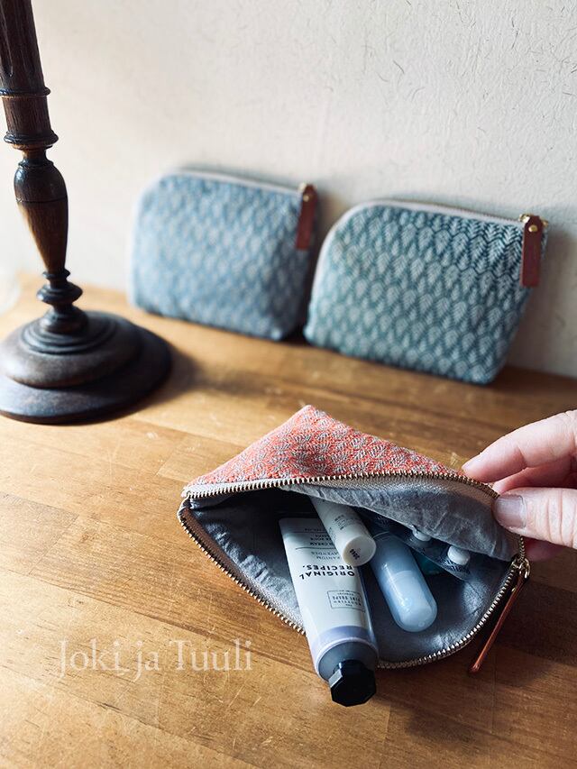 リネンの糸でしっかりと織り上げた手織り布を華やかなポーチに
