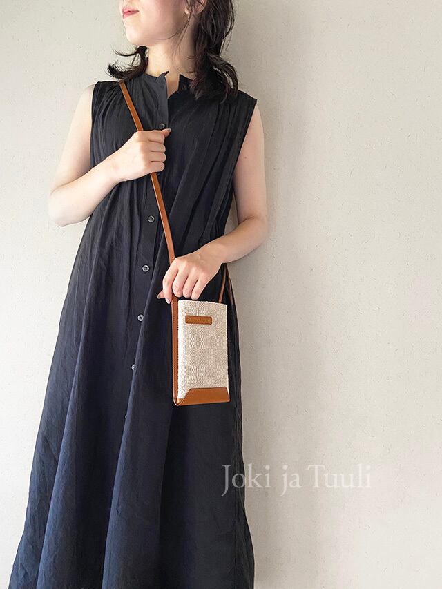 しっかりと織り上げた手織り布と本革を使用し、スマホ用ポシェットに仕立てました。